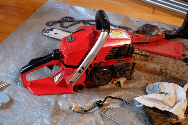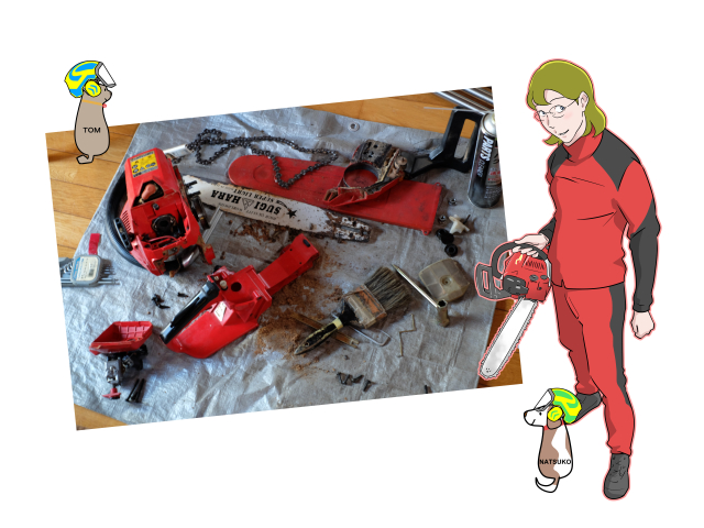 「やっぱ新しいチェーンソー買った方が早くない?」とマーちゃん。
